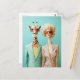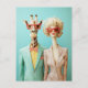 Une image surréaliste de style pop-art avec une girafe et une femme glamour habillée en tenues élégantes d'inspiration vintage. Les deux portent des lunettes de soleil rouges surdimensionnées, dégageant un charme suranné face à un arrière - plan pastel turquoise.