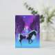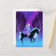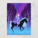 Belle coiffeuse rose avec un arc et une flèche sur le dos, elle monte un cheval noir avec une crinière bleue parmi les arbres de la forêt nocturne. La lune croissant brille dans la nuit bleue