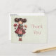 Thank you postcard with a cute retro image featuring a whimsical girl with rosy cheeks and flowers in her hair. Carrying a green frog doll.