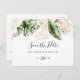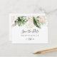 Ce feuillage tropical doré horizontal enregistrer la date carte postale est parfait pour un mariage rustique. Le design est orné d'or aquarelle peint à la main et d'un feuillage vert tropical agrémenté d'élégantes fleurs rousses.