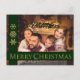 Un design moderne de carte de Noël avec votre photo de famille encadrée par des bandes vertes de Noël et un or brillant Joyeux Noël. Vous pouvez personnaliser l'accueil de Noël à l'arrière, votre adresse de retour et vos noms en script près du bas avec de l'espace pour ajouter une note personnelle manuscrite.