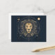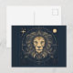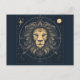 Un graphisme puissant et élégant avec une illustration stylisée et détaillée de la tête d'un lion, symbole du signe du zodiaque de Léo. L'art de la ligne d'or est entouré d'éléments célestes, y compris des étoiles et des constellations, le tout dressé contre un arrière - plan sombre et mystique.