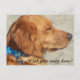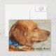 Photographie de Golden Retriever avec visage de sable à la plage. La phrase classique "Souhaite que tu sois là !" sur une carte postale.