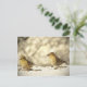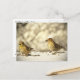 Cette carte postale présente un Siskine de pin qui semble parler à un goldfinch mâle bien qu'il ait une graine de tournesol dans sa bouche! Ils se tiennent dans la neige pendant une journée ensoleillée d'hiver éclairée par une lumière dorée.