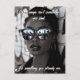 A postcard with an inspirational quote about magic that depicts an African-American woman wearing sunglasses that reflect the city's skyline. She is standing against a wall full of graffiti street art and the whole illustration is in black and white.
