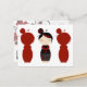 Ce Kokeshi porte un kimono au charbon de bois avec des imprimés floraux. Son kimono a des fleurs et tourbillonne avec des coutures rouges.