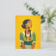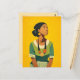 Portrait stylisé d'une femme au teint foncé, orné de bijoux circulaires audacieux et d'une robe verte vibrante. L'arrière - plan jaune minimaliste renforce son expression sereine et confiante, mêlant art moderne et élégance afrocentrique.