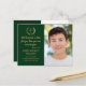 Annoncez votre diplôme de fin d'études secondaires 2020 à votre famille et à vos amis avec cette carte postale personnalisée sur le thème chrétien et faire-part photo et invitation à la fête. L'élégant modèle design présente votre photo avec un verset biblique à gauche dans une typographie de script moderne qui dit "Dieu a plus en réserve pour vous que vous ne pouvez même imaginer." avec votre nom, école, année et date en or sur un arrière - plan vert avec une couronne de laurier or et croix chrétienne au centre. Le dos de la carte postale contient plus de détails sur votre diplôme avec notre invitation à la fête pour vous de customiser accentuée par une croix chrétienne. Félicitations pour votre diplôme ! Conçu par l'artiste Susan Coffey.