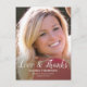Envoyez une carte postale de remerciement élégante à votre famille et à vos amis pour leurs cadeaux de remise de diplômes. Ce design présente votre photo sur le devant avec un script moderne qui lit. "Love & Thanks" en typographie noire avec votre nom, l'école et la classe/année ci-dessous pour personnaliser. L'arrière de la carte présente une illustration d'un bouchon de graduation et un défilement avec un message que vous pouvez customiser. Conçu par l'artiste ©Susan Coffey. Photographie © Storytree Studios, Stanford, CA.
