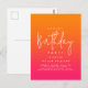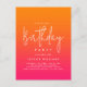 Célébrez votre anniversaire avec un style audacieux et magnifique ! Cette invitation d'anniversaire personnalisée imprimée sur une carte postale fait exactement cela avec ses couleurs dégradées orange vif et rose chaud associées à un texte moderne blanc et un accent de lettrage manuscrit épelant le mot "anniversaire" dans un style fabuleux. Les couleurs ressemblent à un lever de soleil et à l'aube d'une nouvelle ère ! Ces invitations peuvent être commandées à la fois en formats imprimé et numérique à télécharger instantanément.