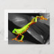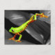 Grenouille à chaux acrobatique vert avec rayures orange et noir sur le ventre, on dirait qu’il fait un stand à main. Amphibien bondissant très coloré sur un arrière - plan noir et blanc.