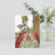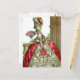 artwork vintage montrant une jeune femme en robe rouge et blanche, probablement du XVIIIe siècle. Elle a une perruque blanche très haute avec des plumes et des fleurs.