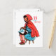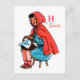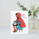 Une jeune fille est assise et souriante dans une cape à capuchon rouge avec un panier de friandises sur son genou.