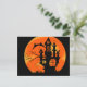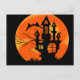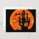 Une image éffrayante d'une maison hantée déplaisante, avec une chauve-souris volante au-dessus, le tout contre une pleine lune orange de sang pour Halloween.