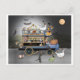 Un bus d'Halloween, rempli d'animaux et suivi de chauves-souris et d'une sorcière est conduit par un lapin sous une lune de moisson.