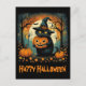 Cette carte postale d'Halloween présente un chat noir portant un casquette sorcier tenant un citrouille déplaisant sur un arrière - plan de pleine lune.