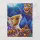 "Masque Vintage de la souris n° 3" Watercolor Art Postcard de l'artiste Jean Weiner "Masque Vintage de la souris n° 3" présente une souris de champ habillée en hibou pour Halloween. Cette souris a même un masque vintage pour compléter le costume. Est-ce une vraie chouette en haut dans l'arbre ? La lumière de la pleine lune jette la lumière sur les arbres éloignés et aidera à guider cette petite souris sur son chemin! Cette oeuvre fantaisiste ravira les amateurs de souris ! Joyeux Halloween !