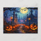 Cette carte postale impressionnante présente un cimetière hanté aligné avec des citrouilles bien éclairés.