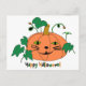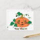 Un visage de chat mignon et amusant orne la citrouille sur cette carte postale d'Halloween. Happy Halloween est écrit en une combinaison de lettres noires, vertes et orange. Des feuilles vertes et des vignes dansent autour de la citrouille.