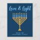 Carte postale Love and Light Hanoukka sur mesure pour une famille juive ou un parti Chanukah avec une synagogue. Personnalisez ces jolies cartes postales avec votre nom de famille ou informations de groupe en bleu sous la jolie menorah or.