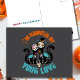 Ces chats crânes de sucre ne sont pas juste effrayants - ils sont désespérément hantés par l'amour. Cette carte postale fantaisiste d'Halloween présente deux chats squelettes aux yeux écarquillés et une petite souris très courageuse, avec la phrase « Je suis hanté par ton amour » qui se détache sur un fond gris foncé audacieux. C'est la façon parfaite d'envoyer des sentiments d'Halloween à quelqu'un qui comprend votre côté effrayant-doux. Le verso comprend un simple message « JOYEUX HALLOWEEN », laissant de la place pour votre propre note sinistre (ou adorable).
