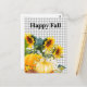 Cette carte postale de l'automne présente des fleurs de soleil et des citrouilles sur un arrière - plan en vichy marron.