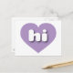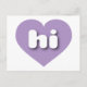 Cette carte postale présente un coeur de lavande cool et informe contenant les lettres coques inférieures blanches et arrondies, une abréviation ludique pour Hawaii, l'état d'aloha. Le verso de la carte postale est vide, en attendant votre texte customisé ou vos sentiments manuscrits.