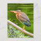 Un oiseau avec un long bec est perché sur une rampe métallique, à côté d'une clôture à chaîne et de verdure, avec un plan d'eau serein dans l'arrière - plan. La scène est vibrante avec le feuillage luxuriant et les reflets dans l'eau.