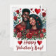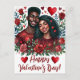 Cette carte postale présente un joyeux couple noir entouré de coeurs rouges et encadré de roses rouges. Le texte dit "Heureuse Sainte-Valentin" mais il est personnalisable. L'aquarelle s'épanouit avec amour et affection dans une palette de couleurs rouge et blanc.
