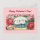 Carte postale de la Saint-Valentin avec une paire de beaux cygnes blancs flottant sur un lac encadré de roses rouges et de oubliettes roses. Cliquez sur Customiser pour ajouter votre propre salut personnel à chaque côté!
