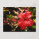 Une fleur d'hibiscus au milieu de feuilles aux bords rouges. Partie d'une haie de jardin à Honolulu, Hawaii.