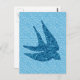 Carte postale dans un support mixte imprimé textile d'une hirondelle en vol, dans un nuage japonais vintage motif de cobalt et bleu pâle contre un arrière - plan tourbillon en bleu et blanc