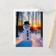 Cette carte postale présente un beau bonhomme de neige dans les bois au coucher du soleil.