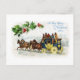 Un staccoach tiré par quatre chevaux à travers la neige et transportant de nombreux passagers, dont l'un joue une corne dans une carte postale vintage de Noël de 1914.