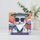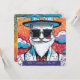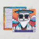 Cette carte est faite d'une illustration colorée d'un homme à la mode avec barbe blanche, lunettes de soleil rectangle et casquette cylindre. C'est une carte d'invitation pour les événements liés à la mode.