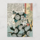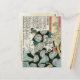 Cette carte postale d’art japonais vintage présente l’imprimé en bois représentant le héros historique samouraï, Hori Ran Maru Nagayasu (保 蘭 永 保), en robe de cour, qui vient de frapper le casquette de la cour de Takachi Michihide avec son ventilateur, de la série Taiheiki Eiyuden de Kuniyoshi ou "Héros de la grande paix" (184) 6-47). L'artiste de cette oeuvre, Utagawa Kuniyoshi, était un maître incontesté de l'impression de bloc de bois guerrier et l'un des derniers grands noms dans le style ukiyo-e japonais. Né à Tokyo en 1797, il devient apprenti auprès d'un célèbre maître de l'imprimerie à l'âge de 12 ans.