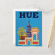 Celebrate the imperial history of Hue, Vietnam, with this graphic vintage travel poster style postcard. The design features a composition of iconic structures, including a tall, tiered pagoda (like Thien Mu) and brightly colored imperial gates and walls, all set against a vibrant blue sky. The bold, graphic lines and contrasting colors create a striking retro look that emphasizes the city's subtitle: "Historic and tranquil." Perfect for history enthusiasts, collectors of Vietnamese art, or anyone sending a unique greeting from this former imperial capital.