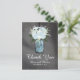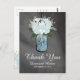 Vue du portrait de Hydrangea Mason Jar Chalkboard | Carte postale Merci Mariage : Parfait pour un mariage de style champêtre ou peut-être que vous aimez juste Mason Jars! Vieux pot Mason Bleu vintage avec marguerites blanches et fleurs d'Hydrangée. Un arrière - plan de tableau noir est placé sur l'avant de la carte postale. Si vous avez des questions sur ce design ou souhaitez un changement de couleur, envoyez-moi un courriel à paula@labellarue.com AVANT de passer une commande afin qu'un nouveau design puisse être créé pour vous.