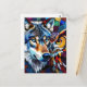 Keep in touch with this colorful vibrant postcard. A vibrant colorful ai illustration of a wolf and an owl in a mosaic stained glass effect.
