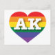 Cette carte postale est dotée d'un coeur orné d'orgueil arc-en-ciel et de lettres AK. Au-dessus des rayures, dans le coeur se trouvent les lettres majuscules gras, blanches, AK, l'abréviation officielle pour Alaska, la dernière frontière. Montrez vos vraies couleurs, soutenez l'égalité dans le mariage et célébrez le gay pride.