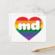 Cette carte postale est ornée d'un coeur de fierté arc-en-ciel, recouvert de lettres coques grasses, blanches et basses md, une abréviation ludique pour Maryland, l'état de l'ancienne ligne. Le revers de la carte postale est vide, en attendant votre texte personnalisé ou vos sentiments manuscrits. Montrez vos vraies couleurs, soutenez l'égalité dans le mariage et célébrez le gay pride.