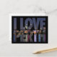 Carte postale avec le texte 'I Love Perth' avec une photo découpée de l'horizon de la ville de Perth et des réflexions sur la rivière Swan.