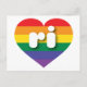 Cette carte postale est ornée d'un coeur de fierté arc-en-ciel avec les lettres coques lustrées, blanches et basses ri, une version ludique de l'abréviation de Rhode Island, l'état de l'océan. Le verso de la carte postale est vide, en attendant vos sentiments manuscrits ou le texte customisé. Montrez vos vraies couleurs, soutenez l'égalité dans le mariage et célébrez le gay pride.