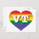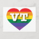 Cette carte postale est ornée d'un coeur de fierté arc-en-ciel orné de lettres majuscules blanches et audacieuses VT, l'abréviation officielle du Vermont, l'état de montagne vert. Montrez vos vraies couleurs, soutenez l'égalité dans le mariage et célébrez le gay pride.