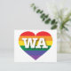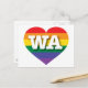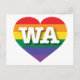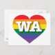 Cette carte postale est ornée d'un coeur de fierté arc-en-ciel orné de lettres majuscules blanches et audacieuses WA, l'abréviation officielle de Washington, l'État à feuillage persistant. Le revers de la carte postale est vide, en attendant vos sentiments personnalisés ou le texte customisé. Montrez vos vraies couleurs, soutenez l'égalité dans le mariage et célébrez le gay pride.