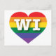 Cette carte postale présente un coeur arc-en-ciel contenant les lettres majuscules en gras et blanches WI, l'abréviation officielle pour le Wisconsin, l'état du blaireau L'envers de la carte postale est vide, en attendant vos sentiments manuscrits ou texte customisé. Montrez vos vraies couleurs, soutenez l'égalité dans le mariage et célébrez le gay pride.