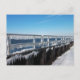 La photo pittoresque montre des icules gelées blanches, soufflées par le vent, gelées. Ils pendent d'une rampe métallique et d'une cloison. La neige peut être vue devant la cloison. L'eau bleue de la baie et le ciel bleu, se retrouvent dans l'arrière - plan. Cette photo de paysage pittoresque a été prise à l'extrémité nord de Long Beach Island à Barnegat Light, New Jersey.