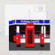 Collage d'icônes anglaises traditionnelles - boîte téléphonique rouge et boîte postale rouge devant un magasin de poissons et de puces. Cette carte postale a été créée à l'aide de photographies numériquement manipulées. La carte postale parfaite pour la personne qui aime tout l'anglais. sgb01