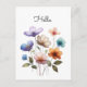 Une illustration aquarelle de jolies fleurs en sarcelle, pêche, vert, violet, bleu. Cette impression botanique est parfaite pour un simple salut Hello, mais vous pouvez modifier le texte pour votre salut préféré. Graphisme assisté par IA acheté avec utilisation commerciale. Œuvre : DreamCafeArt