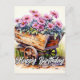Cette carte de vœux d'anniversaire mignonne présente des fleurs d'aster gaies dans un chariot en bois. Cette carte serait idéale pour les amis, la famille et les collègues.